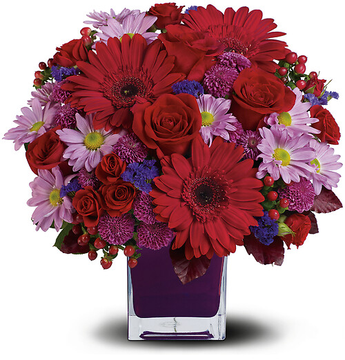 A single red gerbera is surrounded by red roses, lavender button mums, lavender daisies, purple statice, red hypericum and burgundy copper beech leaves. Delivered in a plum-colored glass cube.